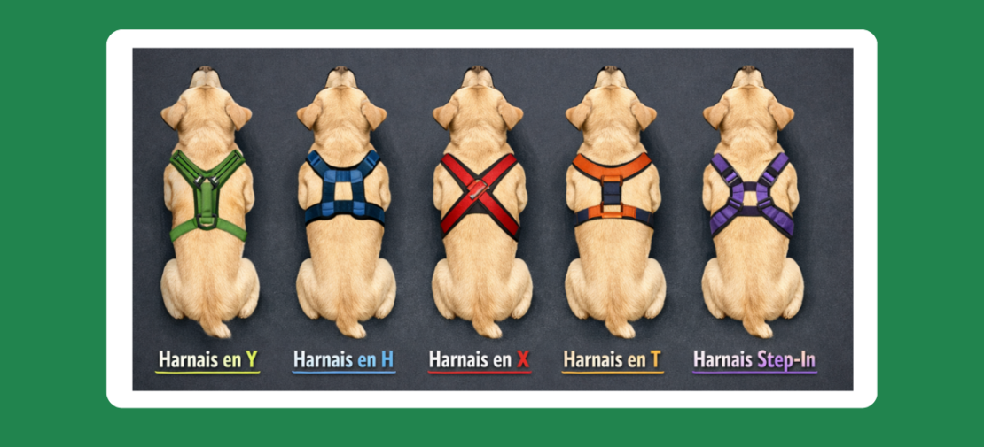 Il dessine un H sur le dos de votre chien. Un harnais en H se compose de deux boucles principales — une autour du cou et une autour du poitrail — reliées par une ou plusieurs sangles le long du dos et du ventre.